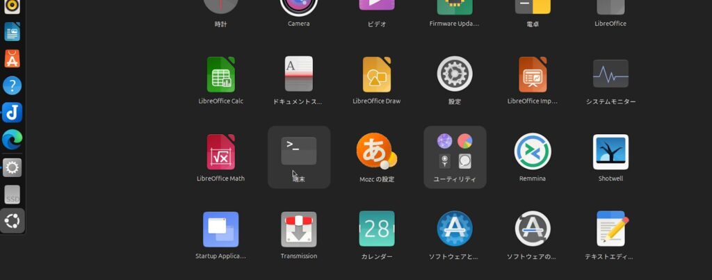何かをインストールするには端末(ターミナルとも呼ばれる)を使います。Ubuntuのアプリの一覧から「端末」を起動します。